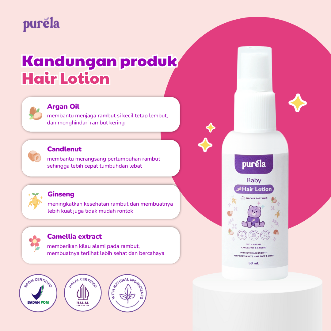 Semprotkan Purela Baby Hair Lotion pada kulit kepala dan rambut si kecil setelah keramas, lalu pijat perlahan hingga cairan untuk memperoleh khasiat terbaik.
